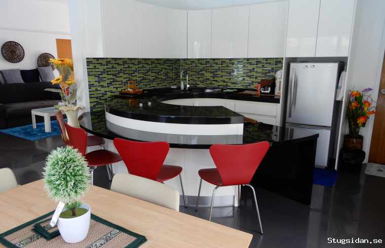 och en stor altan med swimmingpool. Den totala ytan är 80 kvm.