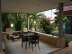 Ljuvlig trädgård med tropiska växter och en sala, som är en