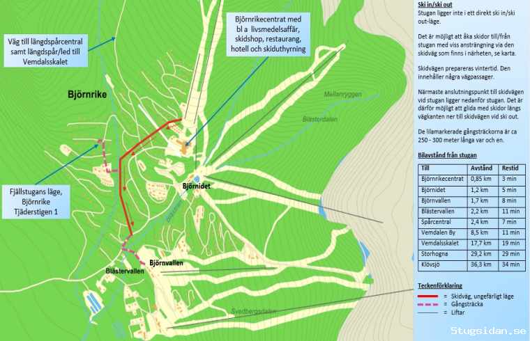 Stugan ligger inte i ett direkt ski in/ski out-läge. Det är