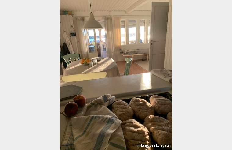 Sjönära stuga med stor, delvis inglasad altan.