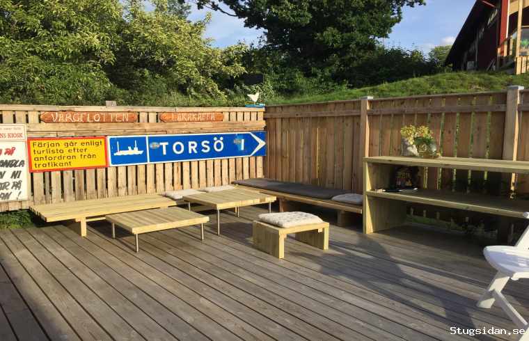 Stugan ligger invid Torsö på fastlandet, från E20 är det 9 km till