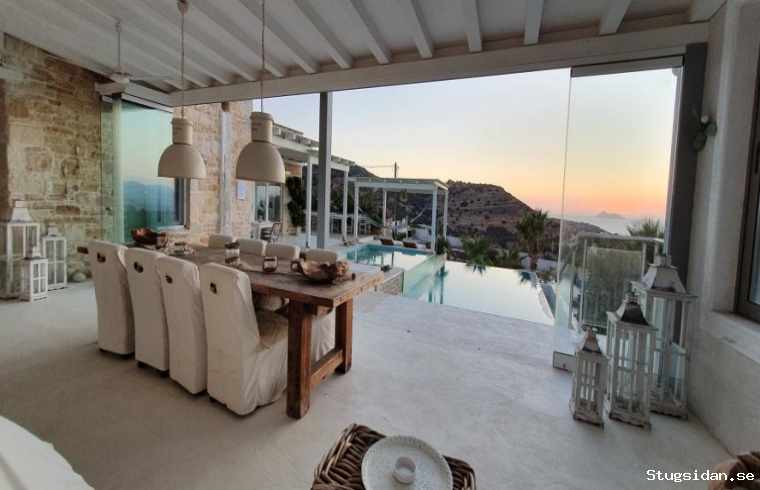 Villa Thea, built in 2013, is located above Pitsidia on a hilltop, the view sweeps over the roofs of Pitsidia to the brilliant sea, fantastic sunsets are granted. Located behind a natural stone wall, hidden from view, the path leads to the villa, past the ornamental garden with a fireplace, wood stove and barbecue, also a lounge area, up a large staircase. Here you meet the incredibly beautiful view of nature and mountains and the view of the house in reality.