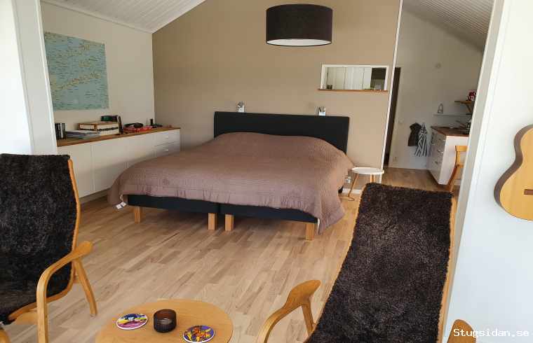 sovrum med dubbelsäng och sittdel, ett litet kök om ni önskar göra te eller kaffe