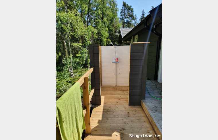 utanför sovrummet finner ni en ute dusch med varmt vatten. Utsikten är
