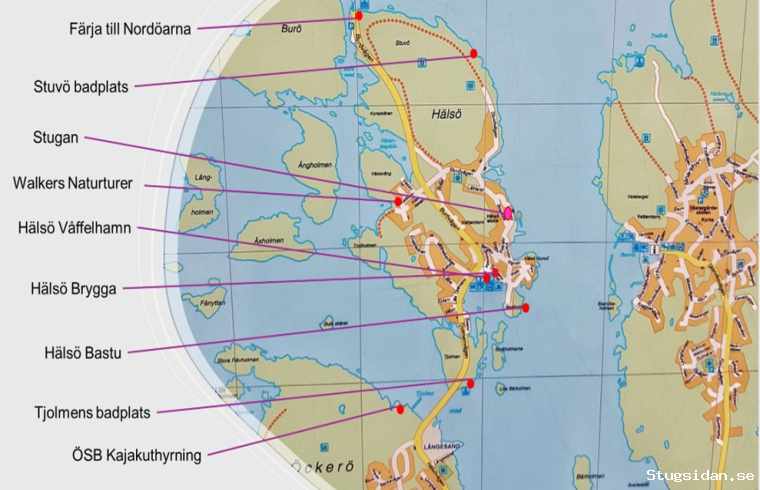 buss X1 till Hälsö hamn. Från busshållplatsen är det sedan 5-7