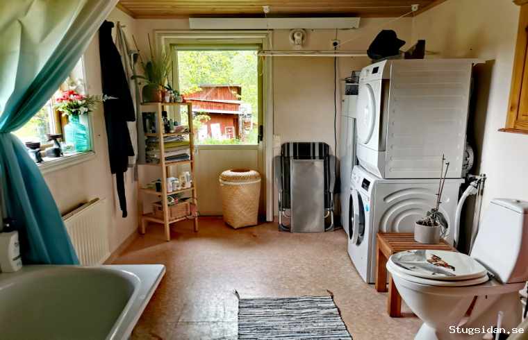 och ett stort badrum med tvättmaskin. På övervåningen finns