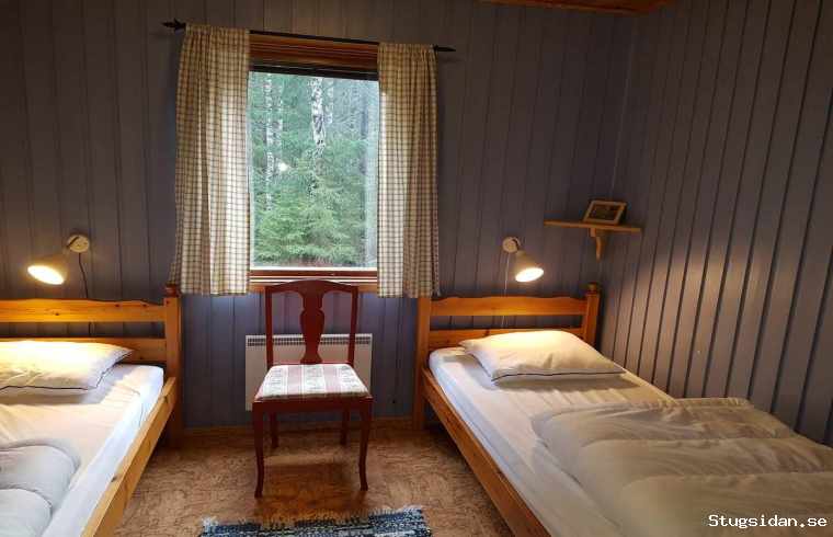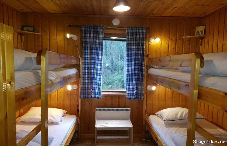 Stugan har ett sovrum med dubbelsäng och ett sovrum med 4 bäddar i våningssängar.