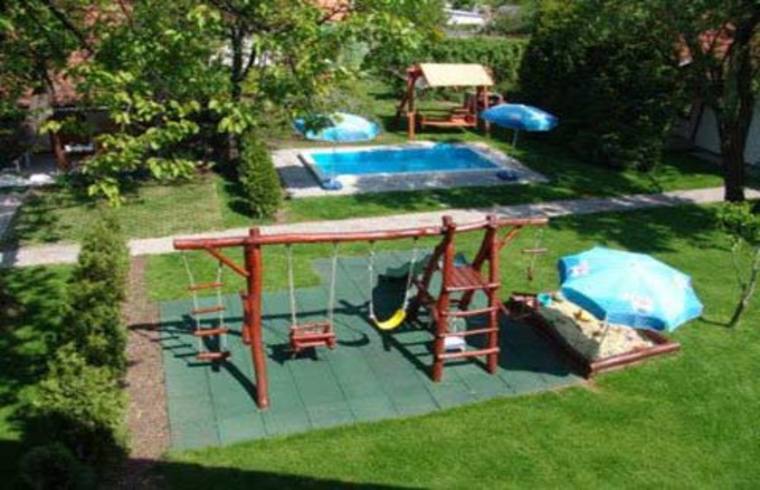 the garden. The pool with the outdoor shower, kid's pool, children's playground