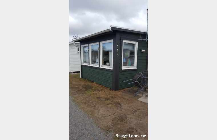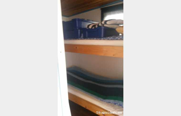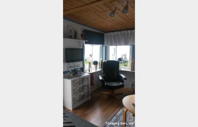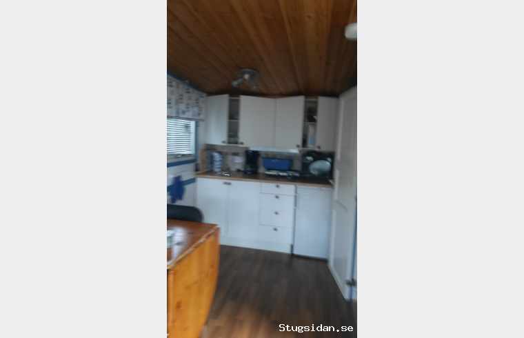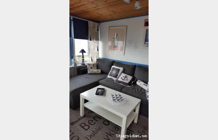 Stugan har en bäddsoffa för två personer, ett litet rum med över och under