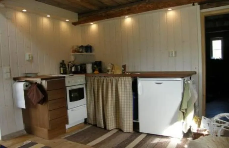 Liten stuga på landsbygden. Litet kök, bäddsoffa och sovloft. Bastu och