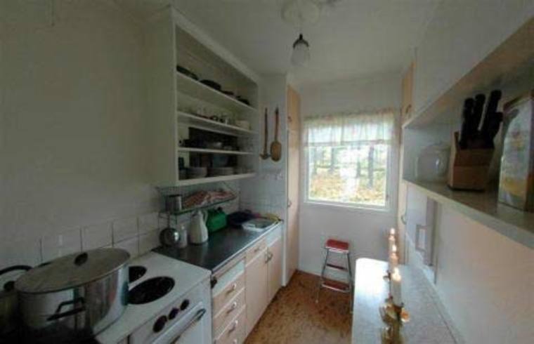 Köket, som saknar rinnande vatten, har vedspis, gasolspis & ugn och gasoldrivet