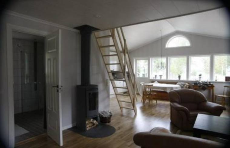 vedeldad bastu och inne i huset finns en vedeldad kamin. Bilder finns på