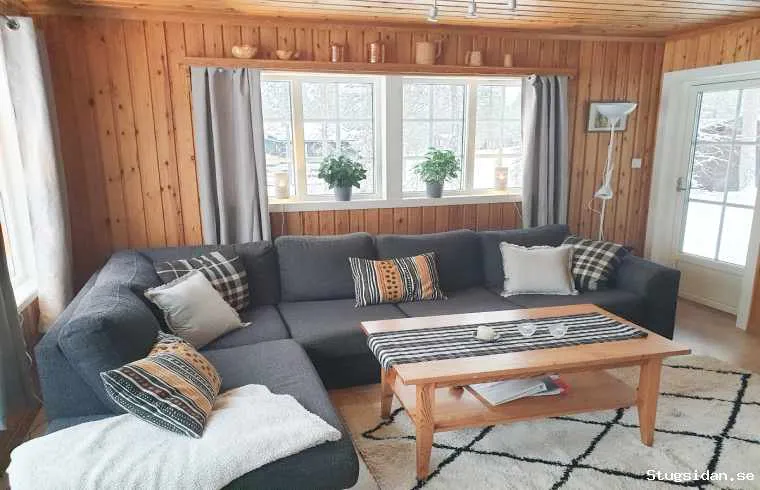 Stugan har allrum med braskamin och stor smart-TV. WIFI.