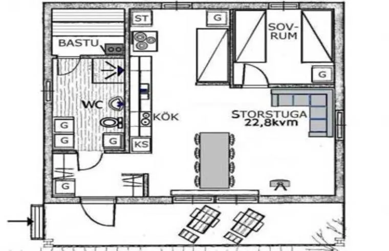 Täcken och kuddar finns i stugan, sängkläder tar ni med själva.