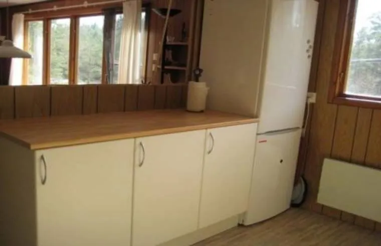 dub. säng, et med dub.säng og våningssäng). Vedspis, el-värme.