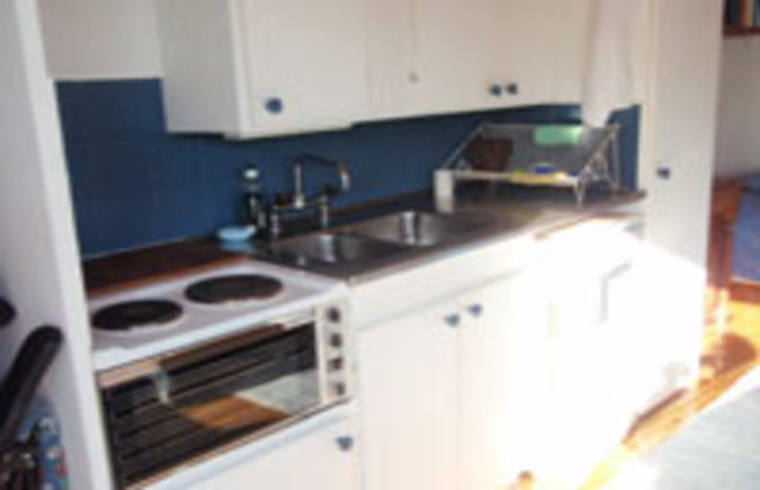 med varmt och kallt vatten, spis, ugn, kyl. Tillbyggnad med dusch och