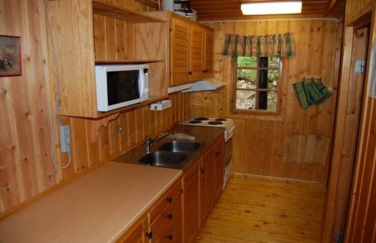 Stugan har fullt inrett kök med elspis, kyl, frys, kaffebryggare och