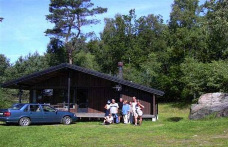 Stugan har ett stort allrum med öppen spis, två dubbelrum, ett