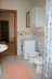 en bäddsoffa för två personer och ett kaklat badrum med dusch, toalett och