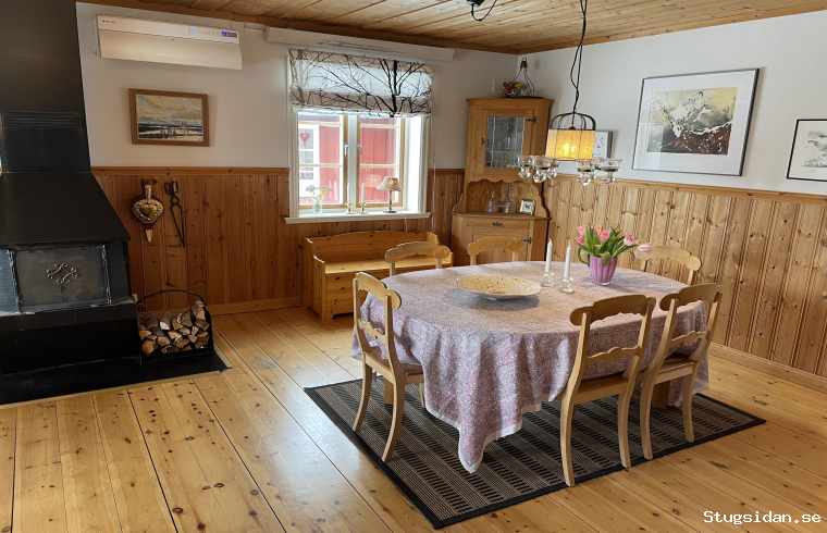 Kök, allrum med bäddsoffa för 1-2 personer, fåtöljer samt matplats för 8