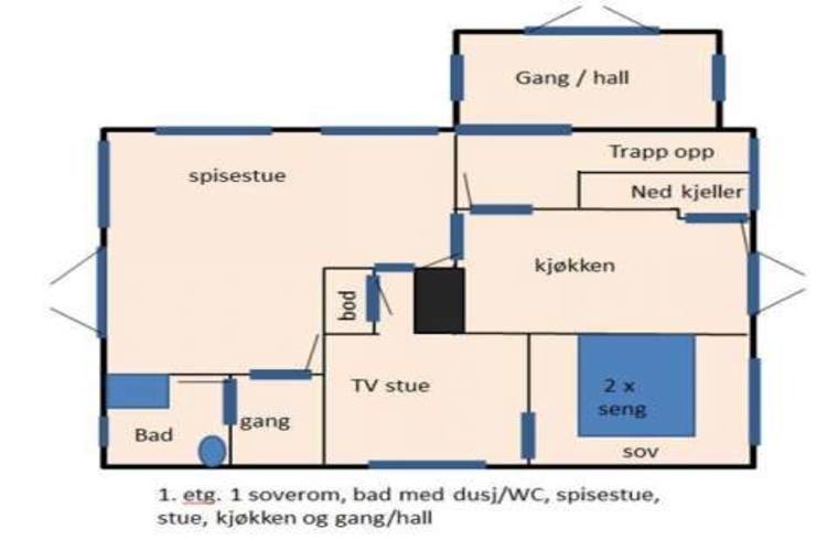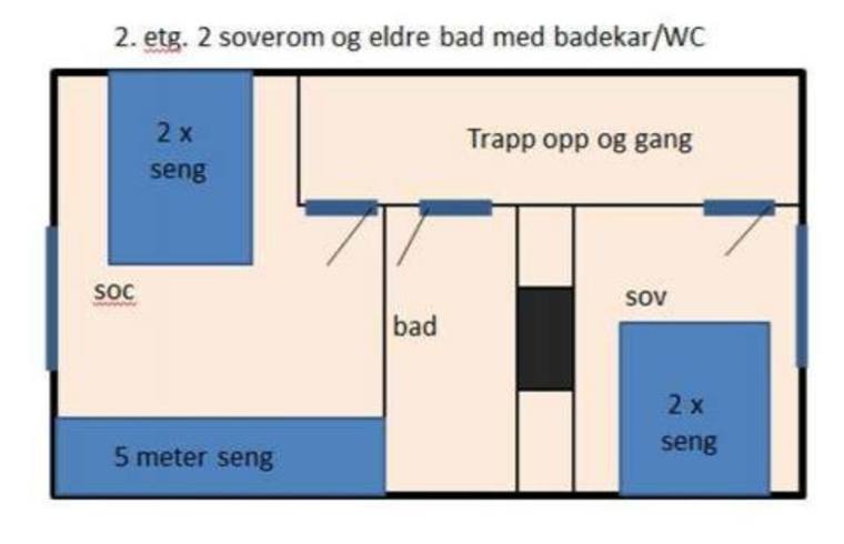 2. etg.: 2 soverom (rom 1: dobbelseng, rom 2: dobbelseng og 5 meter lang seng