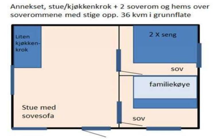 familieseng 2+1, rom 2: dobbelseng) og sovehems (2 senger + madrass), samt en