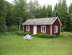 En mysig röd liten stuga med vita knutar, som ligger i lugn och vacker skogstrakt med