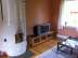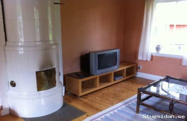 Tv och kakelugn i vardagsrum och täljstenskaminer i sovrum.