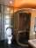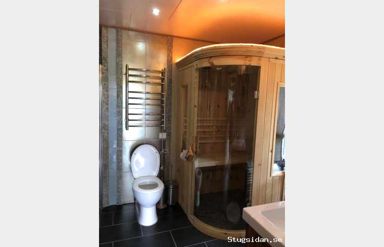 Badrum med bastu. Duschväggar med massagedusch funktioner. Wc och kommod.