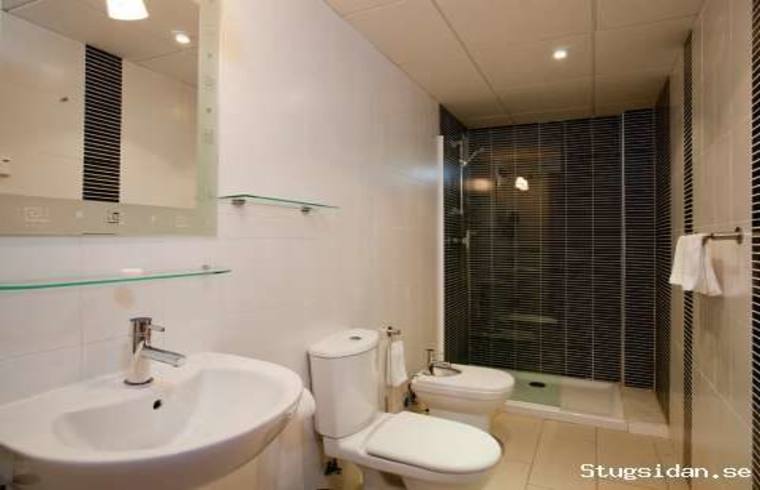 med dusch (två sovrum har ett extra badrum med badkar), kök, vardagsrum och