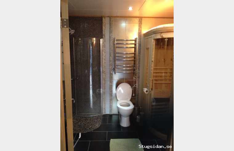 Badrum med bastu, dusch med massagefunktioner. Wc och kommod. Tvättmaskin.