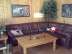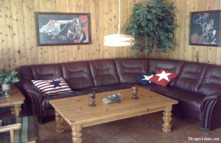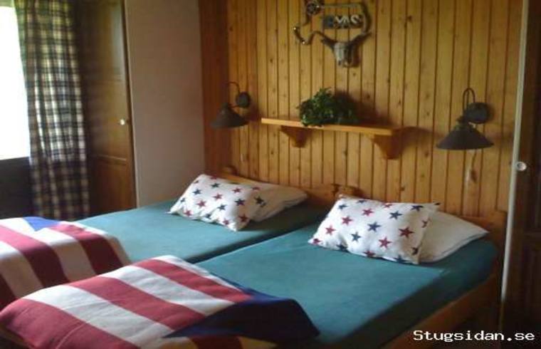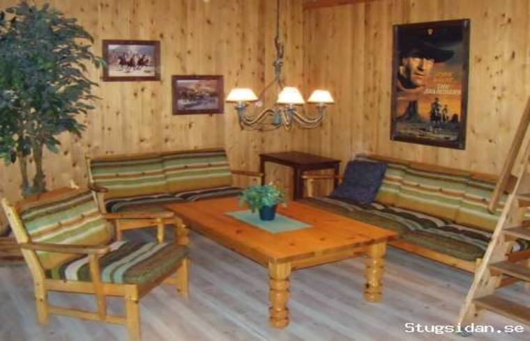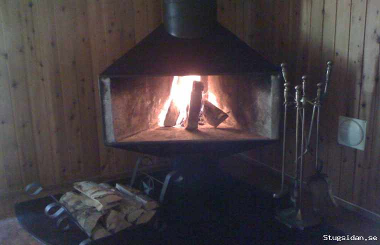 Stugan har ett stort allrum med öppen spis, två dubbelrum, ett