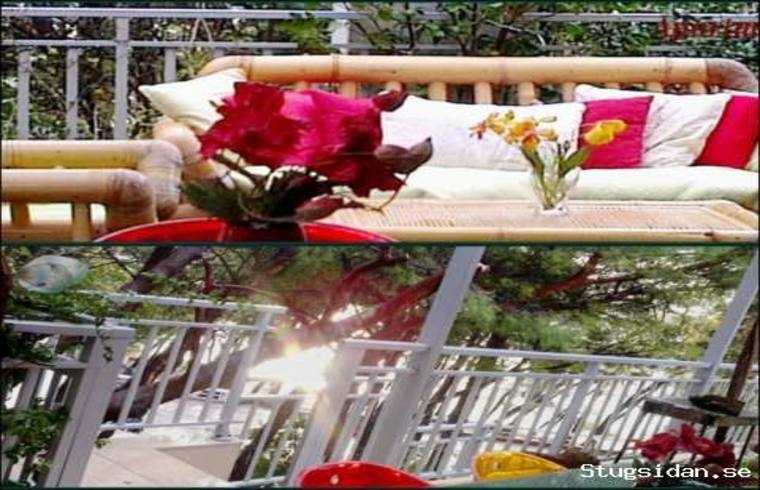 Stor terrass i grönska, matbord + stor bambu möbler, markis, grill