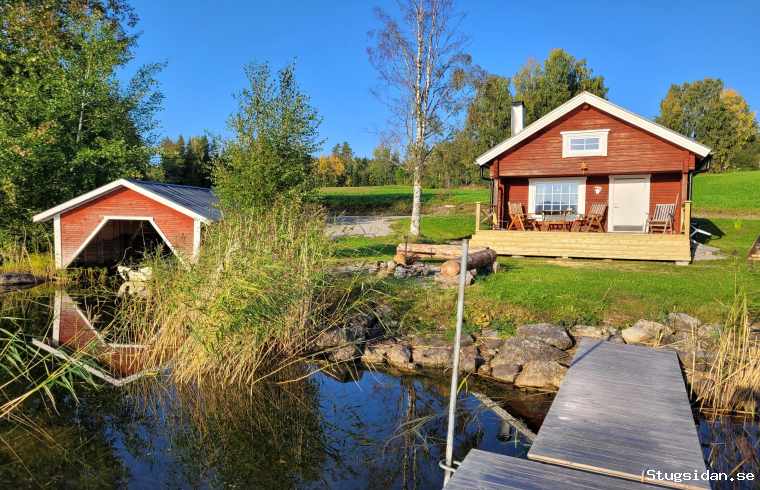 Stugan ligger enskilt med brygga utanför ingången. Roddbåt